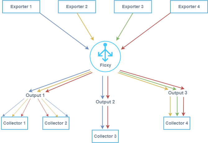 Floxy позволяет распределять трафик от экспортера flow по нескольким коллекторам, указывая правила пересылки для каждого экспортера отдельно.