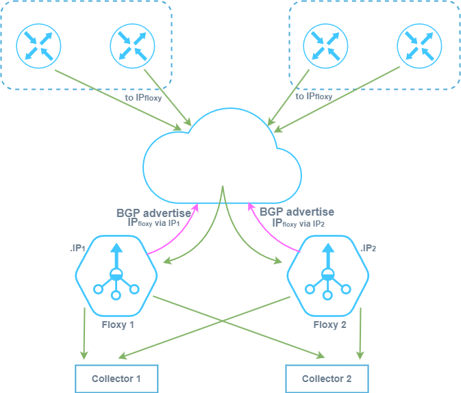 Для этого на loopback-интерфейсах обоих Floxy задается одинаковый IP-адрес — IPfloxy. С обоих серверов, на которых работают Floxy, устанавливаются BGP-сессии с вышестоящим оборудованием, и в анонсе сообщается, что IPfloxy доступен через их nexthop. На всех источниках настраивается отправка flow на IPfloxy.