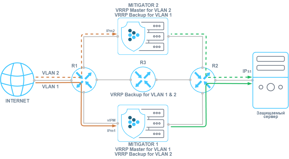 При включении VRRP интерфейсы экземпляров MITIGATOR для внешних устройств представляются одним виртуальным IP-адресом (vIP) и одним виртуальным MAC-адресом (vMAC). При получении ARP-запроса на vIP-адрес VRRP-мастер сообщает сетевому устройству vMAC. Трафик маршрутизируется только на один экземпляр кластера, который в настоящий момент является VRRP-мастером. В случае его отказа статус мастера переходит к другому экземпляру согласно указанным приоритетам. Для внешней и внутренней сетей статусом VRRP-мастера могут обладать разные экземпляры.