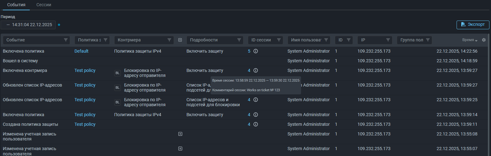 Для повышения прозрачности вносимых в настройки защиты изменений во время эксплуатации, а также для удобства фиксации как самих изменений, так и мотивации к ним, или другой дополнительной информации по проводимым работам, добавлена «Сессия редактирования».