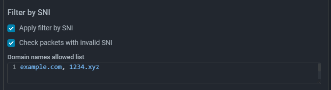 Optional checking by Server Name Indication (SNI) has been added to the countermeasure. When a filter is set, only traffic from sessions with a «ClientHello» containing a matching SNI is translated to WebC. Clients sending a «ClientHello» without an SNI or not in the list are authenticated.
