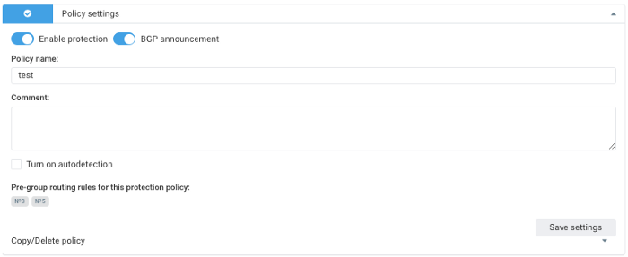 Варианты внедрения с использованием BGP на практике показывают свою универсальность, даже в случаях постоянной защиты ресурсов. Для повышения удобства и гибкости работы добавлена возможность управлять анонсированием префиксов политики из самой политики.