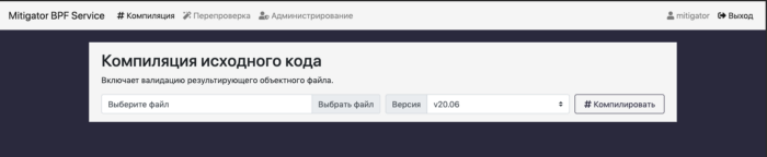 Для упрощения процесса разработки под BPF создан сервис bpf.mitigator.ru. Сервис позволяет компилировать исходный код и валидировать объектные файлы под разные версии MITIGATOR.