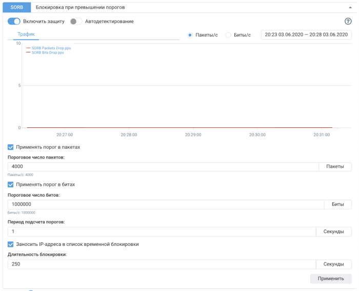 Для описания легитимного трафика требовалось указывать скорости меньше одного соединения в секунду. Например, 2 соединения за 5 минут. Поэтому изменен формат порога. Теперь задается «Пороговое число запросов» и «Период подсчета порога». Для блокировки хоста, устанавливающего больше двух соединений за 5 минут, нужно указать: