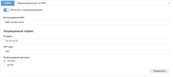 Например, на хосте 10.10.10.10 запущено несколько TCP и UDP сервисов, в том числе веб-приложение, работающее по HTTPS. Необходимо трафик веб-приложения пропустить через WAF, а остальной — напрямую к хосту. С помощью WAFR можно прозрачно направить HTTPS-трафик на WAF или другое подобное устройство. При этом на WAF может быть настроена отправка атакующих адресов на блокировку в MITIGATOR.