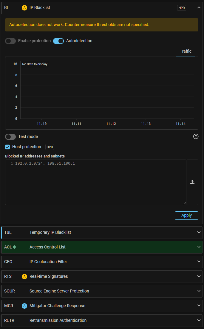 Now, if you switch a countermeasure to autodetection mode, but do not set any threshold for activation, the auto-detection indicator will be highlighted in yellow, and a corresponding warning will appear inside the countermeasure card.