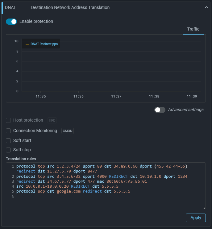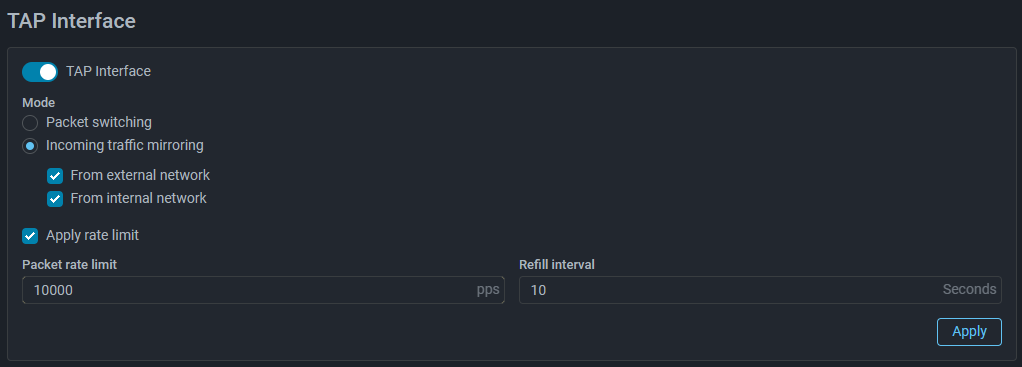 Added an operating mode in which incoming traffic from external and internal networks can be mirrored to the TAP interface.