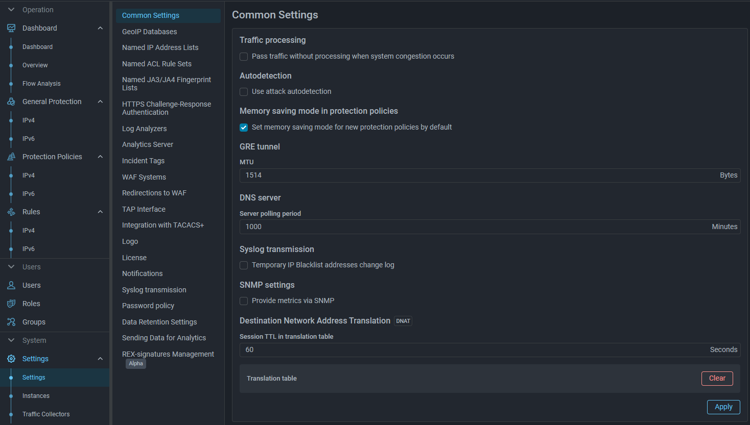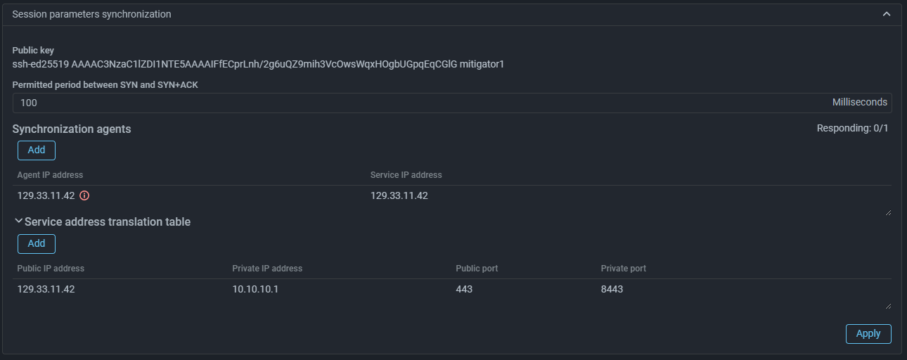 Previously, protection scenarios using ISN synchronization had problems when the protected server was behind NAT. In the “Session parameters synchronization” panel in the translation table, you can now match public and local IP addresses and ports of protected services.