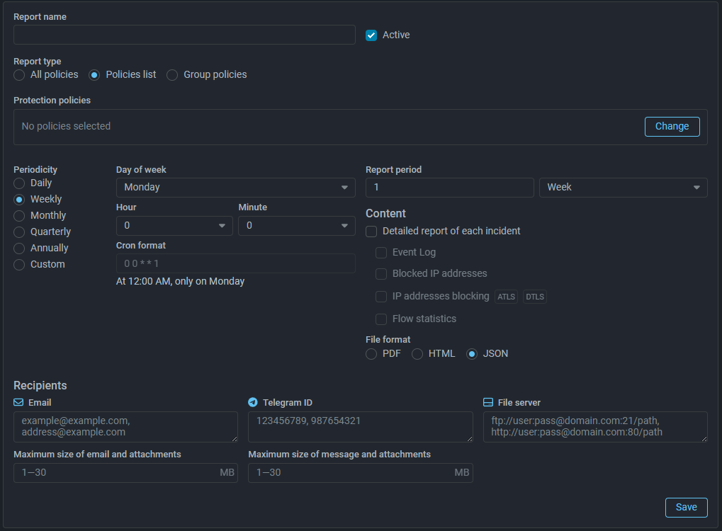 Reports. Added the ability to send a regular report in JSON format.