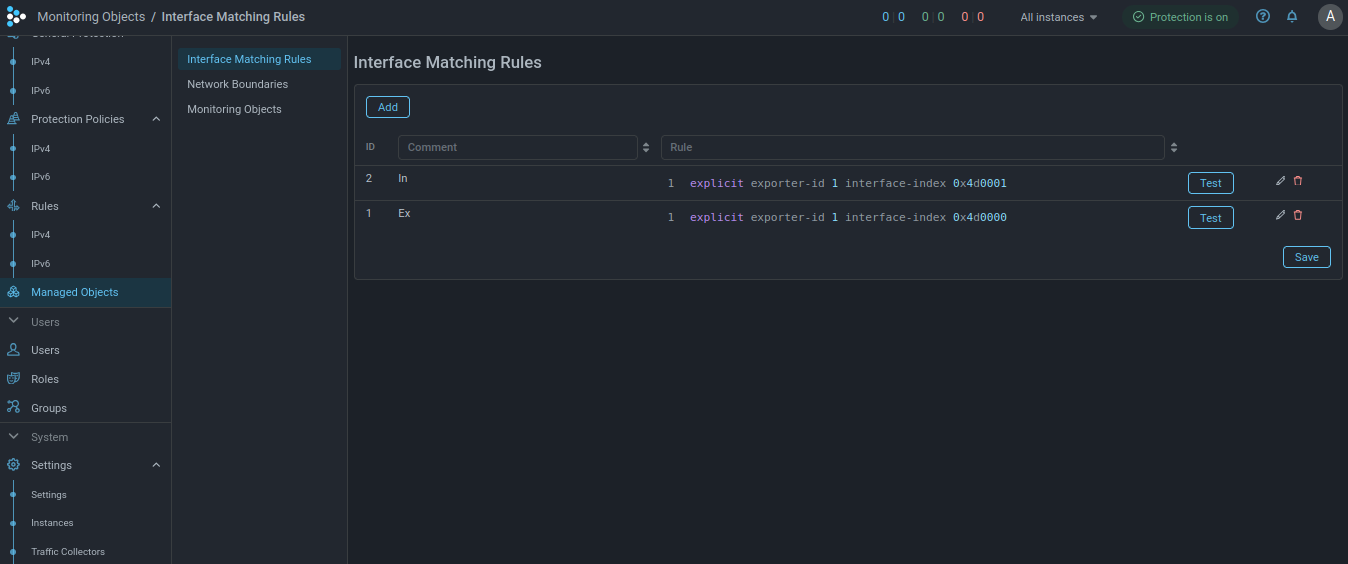- flow can be associated with only one protection policy, but with several monitoring objects. For example, different monitoring objects describe AS, a prefix in it, a host and a service, then the traffic of the connection to the service can be taken into account in all four monitoring objects;