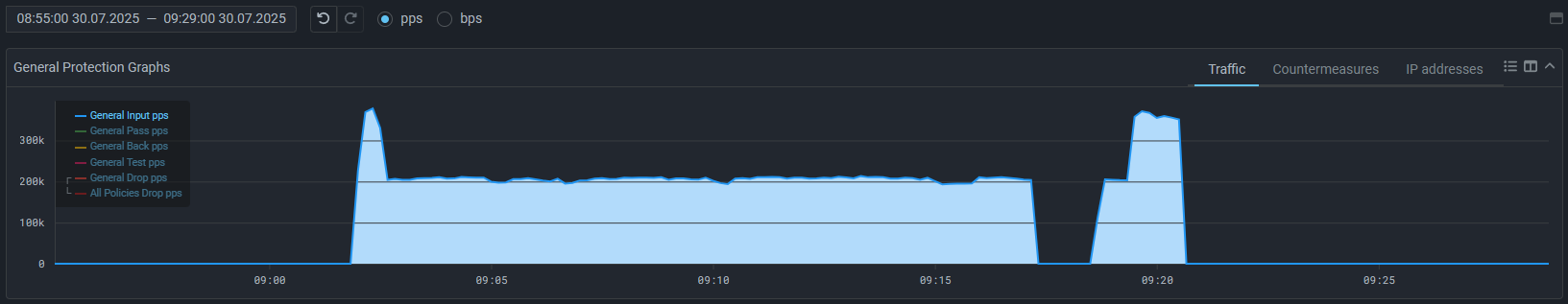 In this mode, the countermeasure does not affect traffic as long as the rate of traffic entering the countermeasure does not exceed the activation threshold value in packets or bits per second. When the traffic rate drops below the deactivation threshold, traffic processing stops. This mechanism allows filtering to be activated in milliseconds.