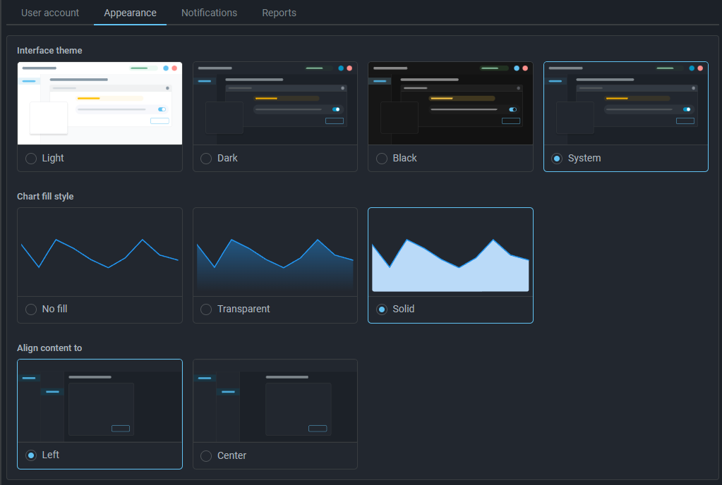 Now the interface theme, graph fill and content alignment settings are applied immediately when you select the corresponding radio button and do not require confirmation.
