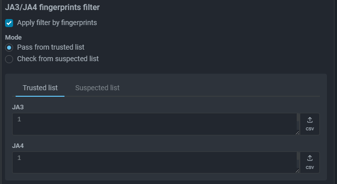 Optional checking against trusted and suspected JA3/JA4 fingerprint lists has been added to the countermeasure. If a fingerprint is in the trusted list, the client with that fingerprint is authenticated; others must pass the challenge. If a fingerprint is in the suspected list, the client with that fingerprint must pass the challenge; others are authenticated.