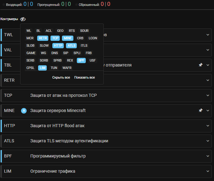 Скрыть контрмеры, которые не будут применяться в политике можно, нажав на иконку над списком контрмер. Кнопка «Скрыть все» отключает отображение всех контрмер политики, кроме активных (включена контрмера, включено обучение, включено автодетектирование).