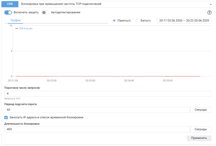Для описания легитимного трафика требовалось указывать скорости меньше одного соединения в секунду. Например, 2 соединения за 5 минут. Поэтому изменен формат порога. Теперь задается «Пороговое число запросов» и «Период подсчета порога». Для блокировки хоста, устанавливающего больше двух соединений за 5 минут, нужно указать:
