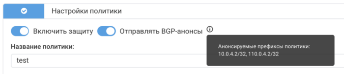 BGP. Анонсируемые префиксы автоматически актуализируются при изменении правил, указывающих на политику защиты.