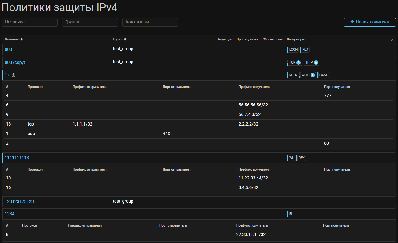 Нажатие на стрелку в заголовке таблицы политик раскрывает или закрывает списки правил для всех политик защиты.