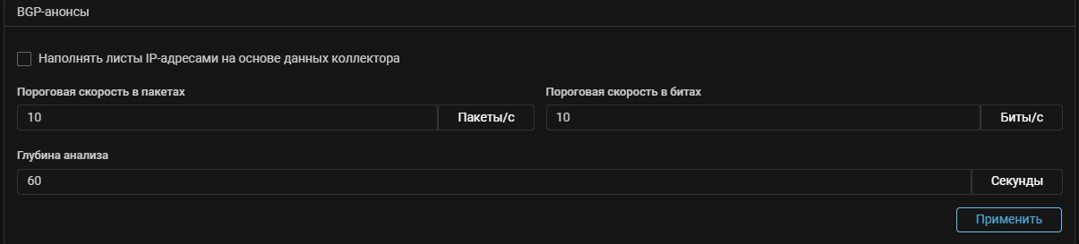 Теперь в карточке «BGP-анонсы» на вкладке «Настройка политики» страницы «Политика защиты» можно задать пороги скорости в пакетах и битах в секунду. IP-адреса получателя, для которых на коллекторе превышены пороги, могут анонсироваться по BGP для постановки на защиту.
