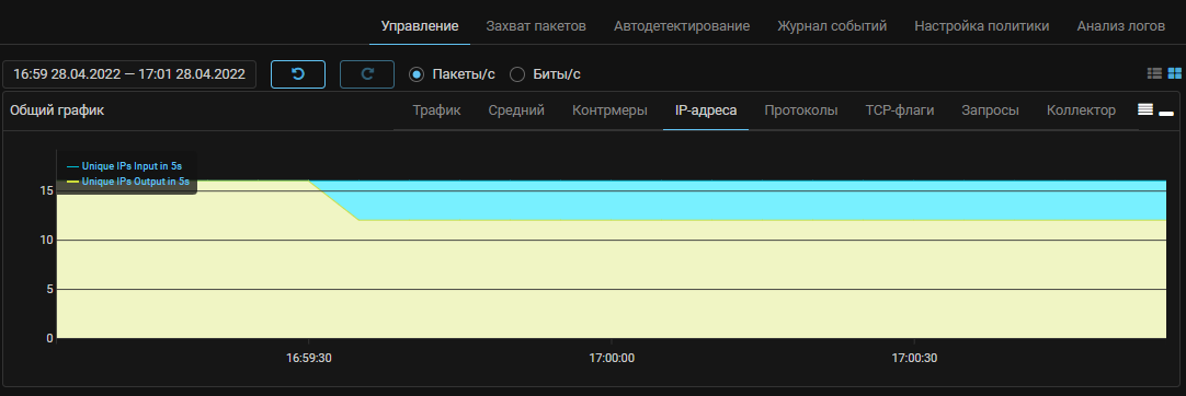 Теперь на графике IP-адресов отображается количество уникальных адресов на входе и выходе политики защиты.