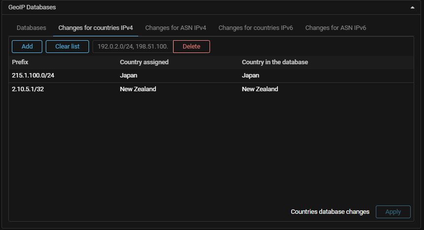 Теперь пользователь может вносить изменения в загруженные базы данных, изменяя принадлежность IPv4 и IPv6 адресов стране и ASN. Вносимые изменения сохраняются при обновлении баз.