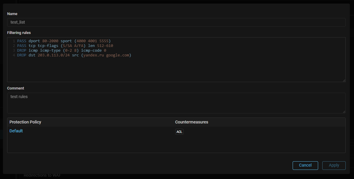 ACL6. Добавлена поддержка именованных наборов правил фильтрации.