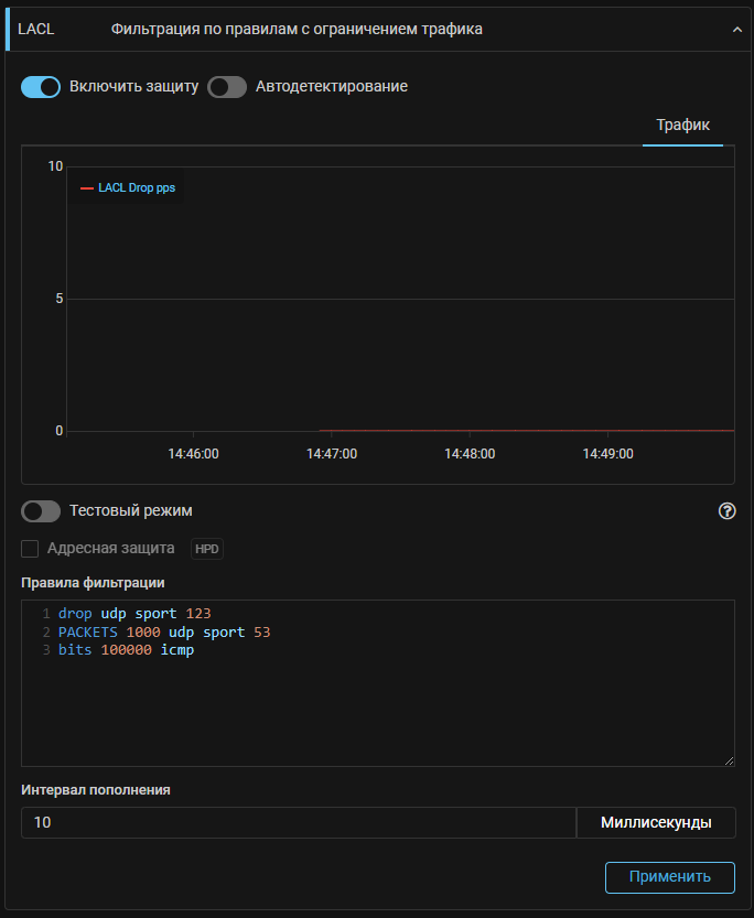 PASS– пропустить;DROP– сбросить;PACKETS<число> – ограничить в пакетах в секунду;BITS<число> – ограничить в битах в секунду;PACKETS<число>BITS<число> – ограничить в пакетах в секунду и битах в секунду.
