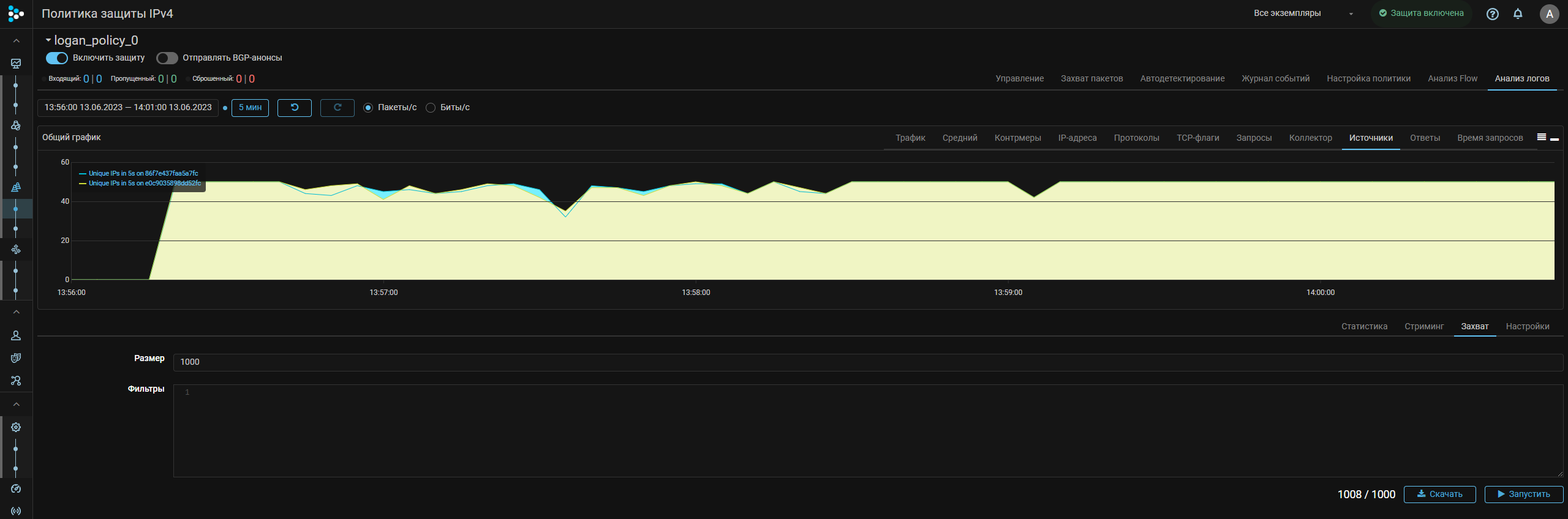 Теперь на странице «Анализ Flow» можно выгрузить CSV-файлы с данными за указанный временной интервал аналогично вкладке «Анализ Flow» страницы «Политика защиты».