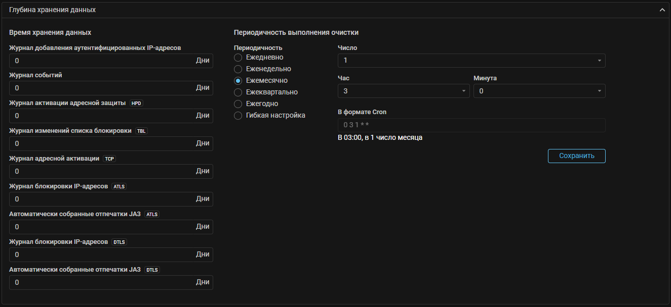 Механизм с заданной периодичностью удаляет из системы записи старше указанного времени хранения. Время хранения для различных данных задается независимо.