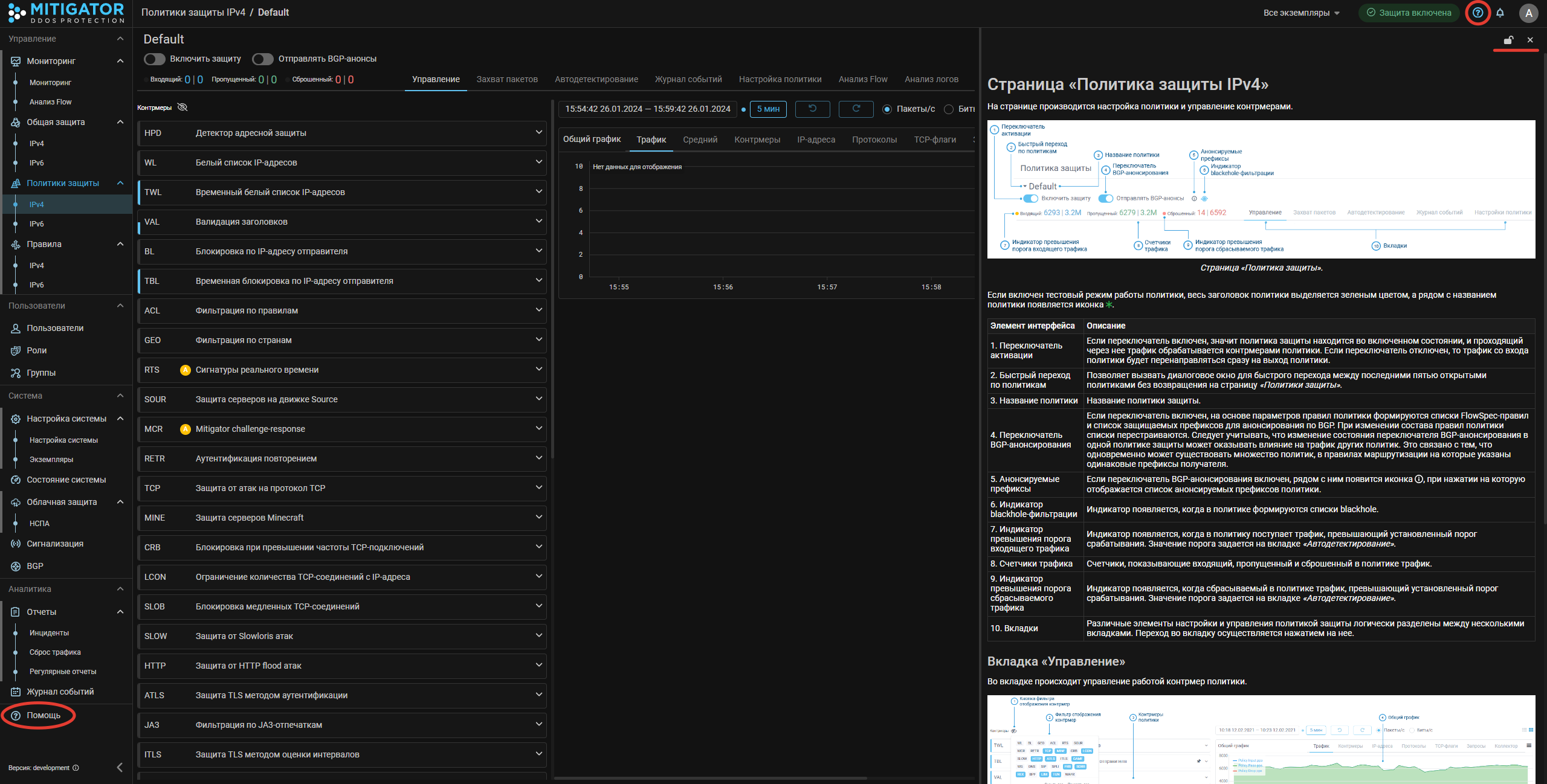 Теперь, не переходя в общую справку, можно посмотреть описание открытой в данный момент страницы или вкладки. Особенно это удобно для вкладок Анализ логов и Анализ Flow. По нажатию на вопросительный знак теперь открывается не полная справка по системе, а только описание текущей страницы. Общая справка перенесена в раздел главного меню. Размеры окна с контекстной справкой настраиваются. Окно можно жестко закрепить на странице или показывать только при наведении курсора. При переходе между разделами интерфейса содержимое окна меняется автоматически.