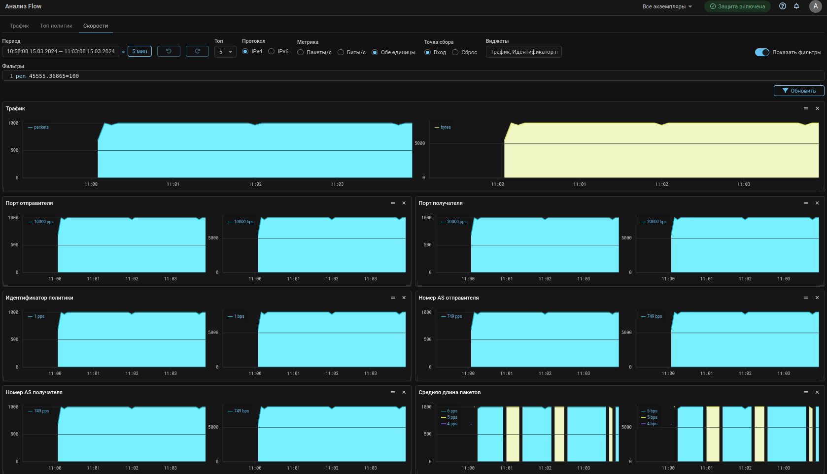 На страницу «Анализ Flow» добавлена вкладка «Скорости», на которой отображаются данные с Коллектора в виде графиков. Данные сгруппированы по категориям, графики по каждой категории отображается в отдельных виджетах, для которых настраиваются размер и расположение на странице. Отображение каждой категории задается флагом. Можно задать произвольный фильтр, в этом случае на всех графиках будут отображаться только данные, соответствующие введенному фильтру. Между строками логическое “И”. Таким образом, можно например построить график flow, поступившего c конкретного источника, или с конкретного диапазона портов.