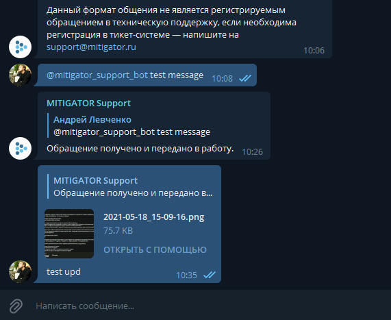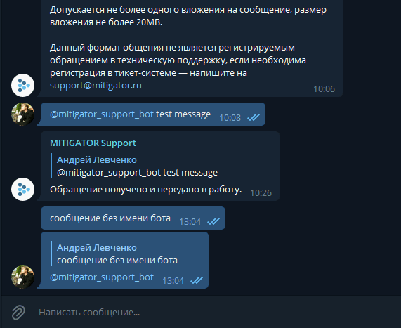 Обращение к боту может содержать вложения, но не более одного файла в одном сообщении. Размер файла не должен превышать 20MB. Это удобно для предоставления специалистам MITIGATOR детальной информации по сложившейся у пользователя проблеме.