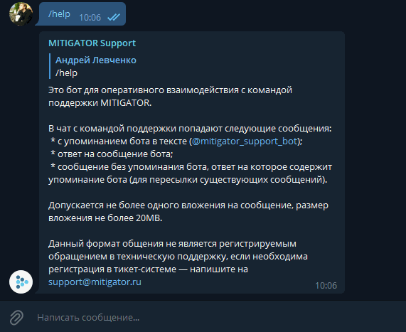 Отправленное сообщение будет получено командой MITIGATOR для анализа возникшей у пользователя проблемы и подготовки ответа. Когда ответ будет подготовлен, специалист ответит на сообщение. Пользователь получит ответ в том же чате, из которого отправлял обращение.