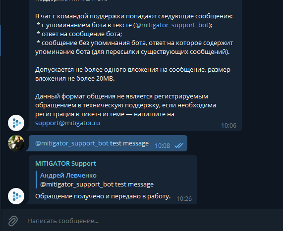 Для оперативного взаимодействия с командой разработчиков MITIGATOR действует Telegram-бот. Данный формат общения не является регистрируемым обращением в техническую поддержку, но позволяет быстро получить консультацию по вопросам настройки и работы MITIGATOR.