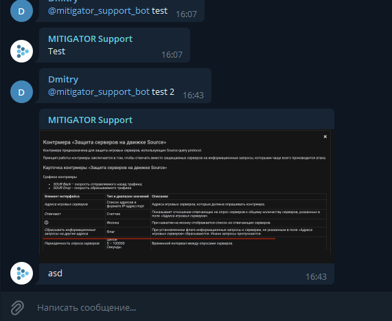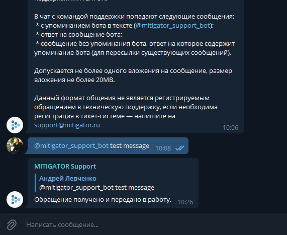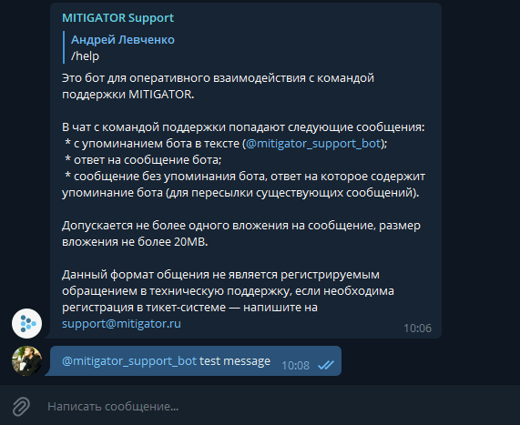 For rapid interaction with the MITIGATOR development team, a Telegram-bot is used. This communication format is not a registered call to technical support, but allows you to quickly get advice on setting up and operating MITIGATOR.
