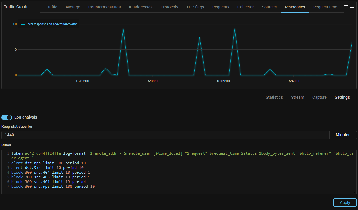 When the rules are set and applied, access to tabs with statistics, real-time streaming of logs and capture opens.