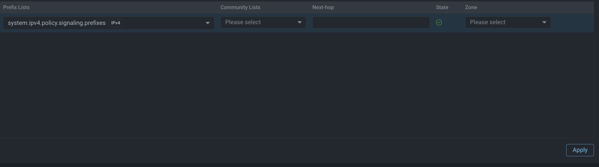 .signaling.lists in the announcement policy for this BGP neighbour. Signaling lists can be populated according to different criteria, list selection depends on the scenario. As an example we usesystem.policy.signaling.prefixeslist. Special nexthop and community are defined as needed, according to the requirements of MITIGATOR ISP.