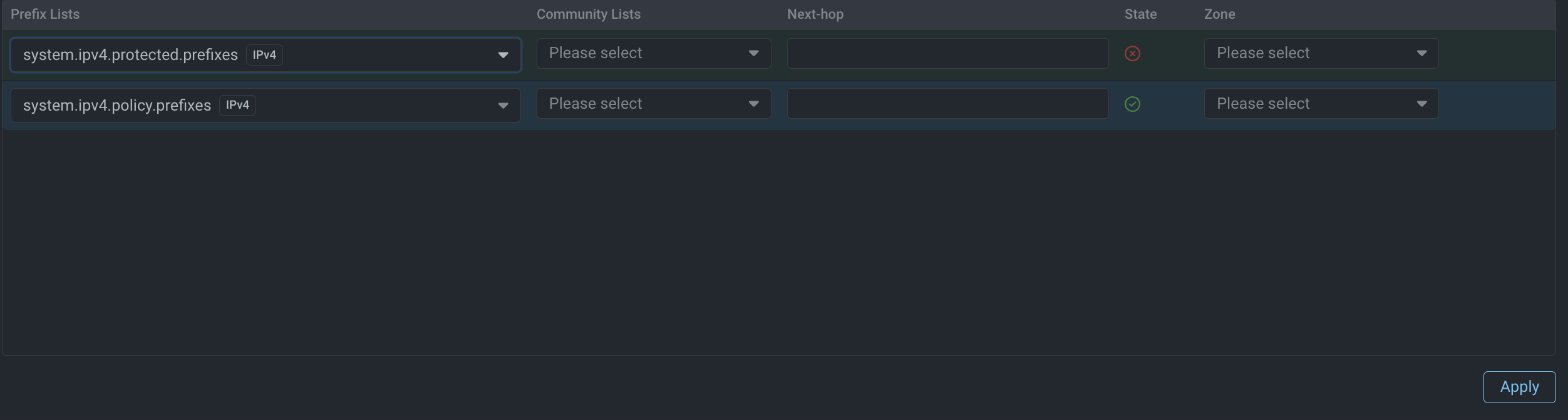system.protected.prefixeslist announcement control in the policies responsible for MITIGATOR CPE traffic. It will be automatically announced to all BGP neighbours for which it was added to the announcement policy, while BGP announcement is active and the list is not empty. -