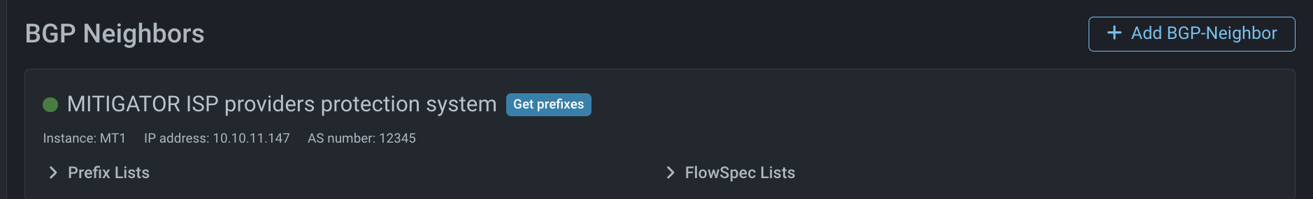 Create BGP neighbours that MITIGATOR ISP will send BGP announcements for traffic redirection.