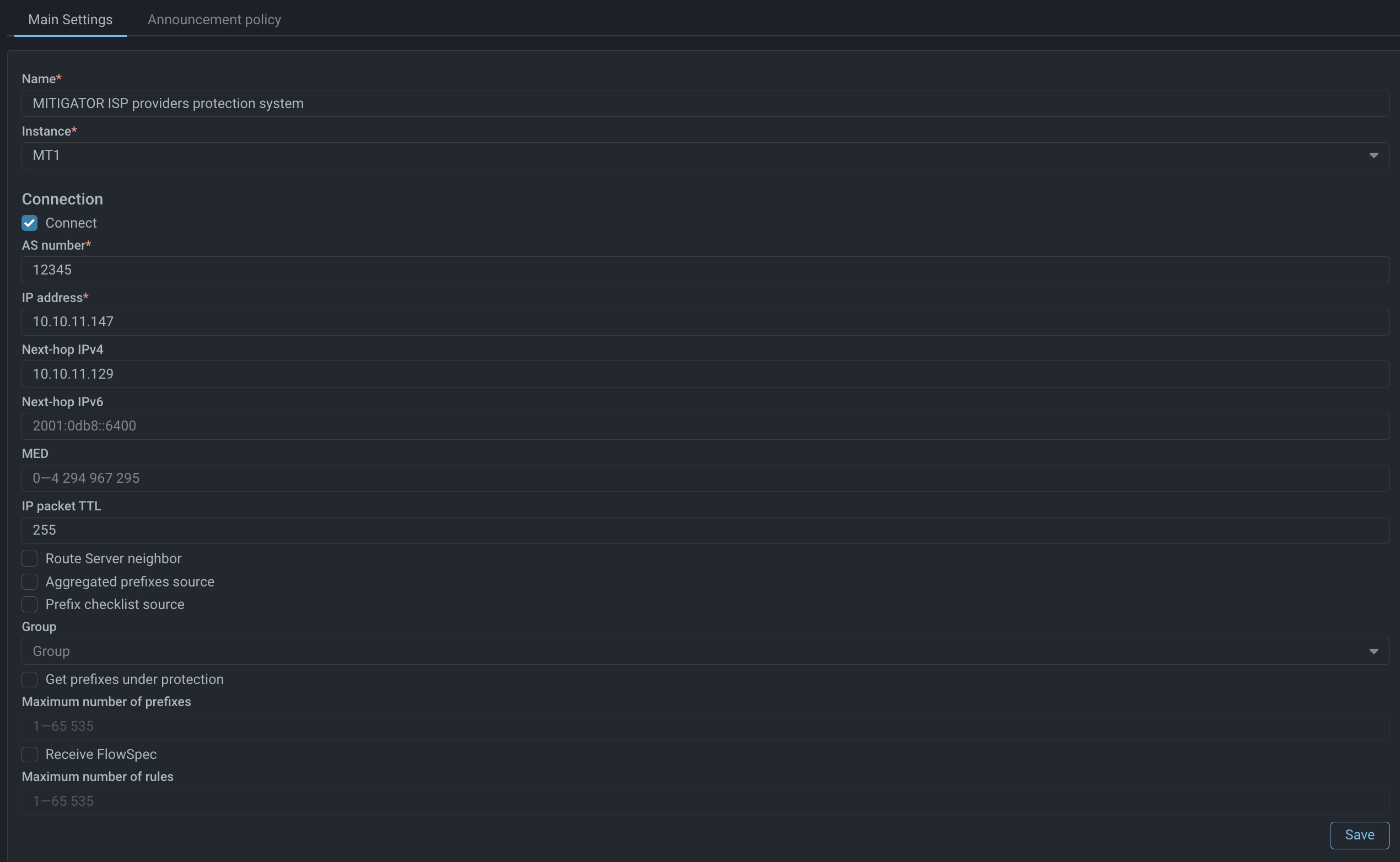 2.1. In the BGP neighbour settings specify the network parameters of MITIGATOR ISP, such as IP address and AS number. The rest of parameters is optional and configured as needed. It is recommended to specify high TTL value for IP packets, since MITIGATOR ISP may be located far away.
