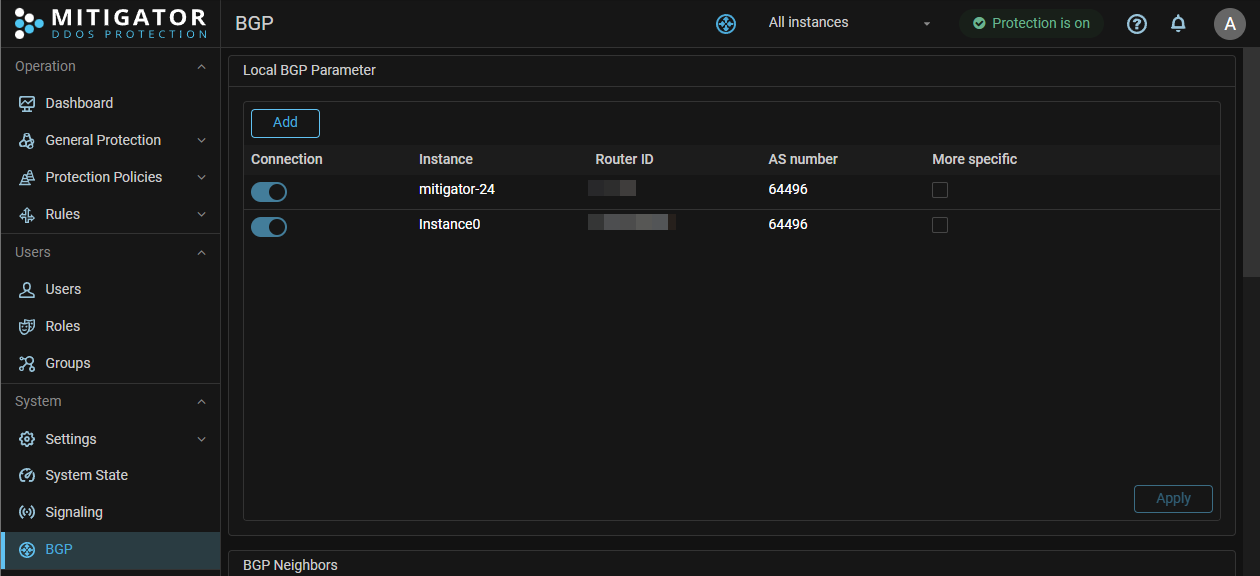 If MITIGATOR is configured to announce protected prefixes over BGP, then before updating the instance, disable the BGP connection for the instance being updated in the «Local BGP Settings» on the «BGP» page.