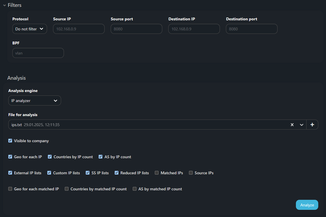 Specify the path to the local file in appear window. You can specify a traffic dump in PCAP or PCAPNG formats, as well as a text file containing IP addresses, prefixes, JA3 hash, JA3 fulltext, User-Agent.