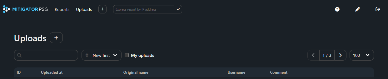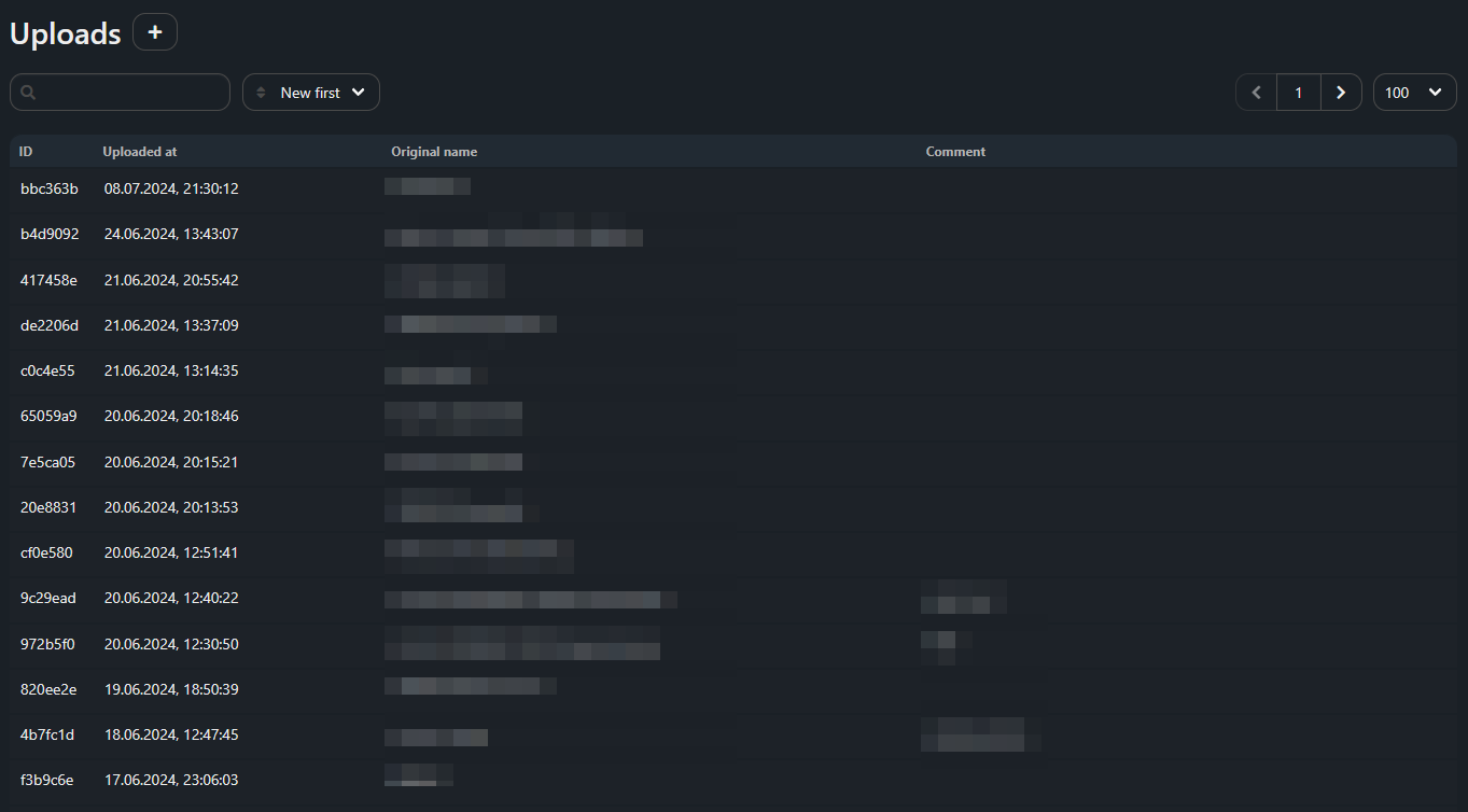 Uploaded files are displayed in the list on the “Uploads” page. Filtration for any field and sorting by date are provided. The page has pagination. The number of files displayed on the page is configurable.