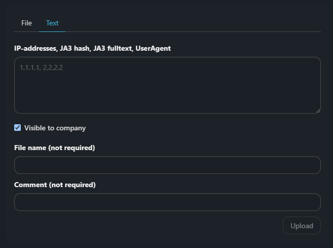 You can enter IP addresses, prefixes, JA3 hash, JA3 fulltext or user-agent values manually. In this case, a text file will be generated from the entered values.