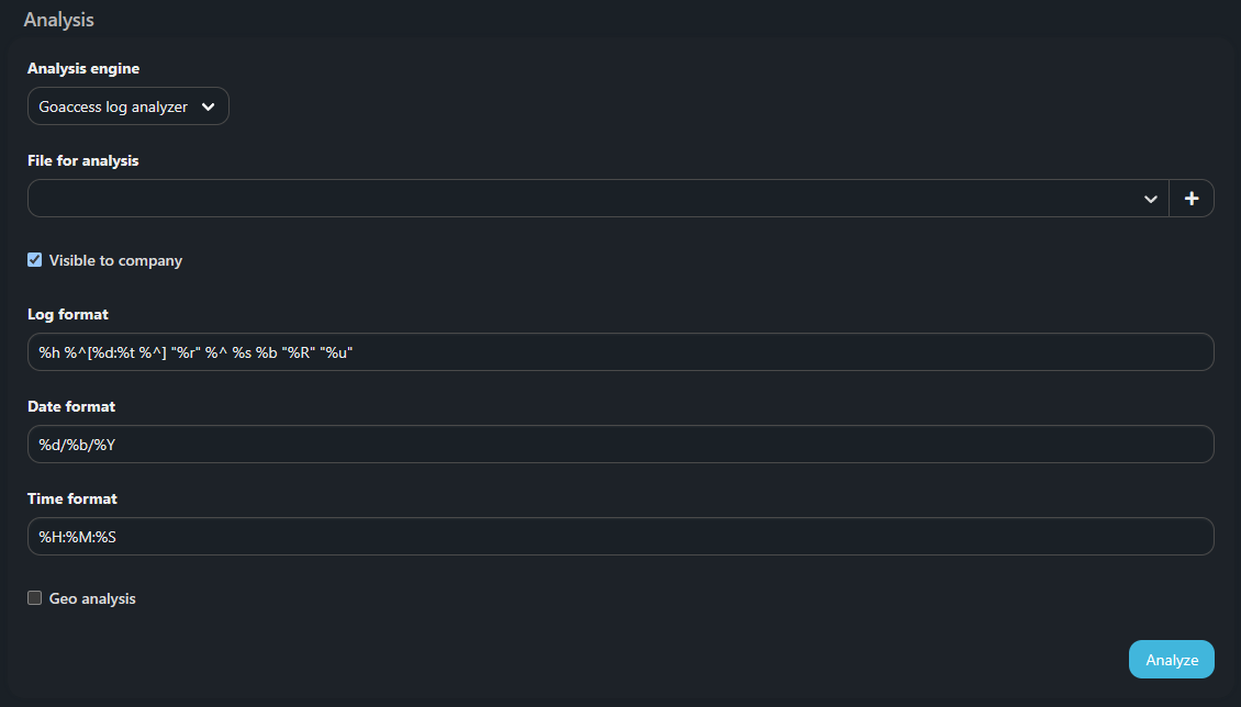 Goaccess log analyzer analyzes web server logs. Can be used alone or in combination with «Log Analyzer» to obtain additional statistics.
