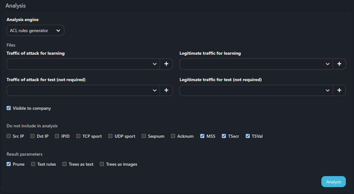 Traffic dumps are selected from the drop-down list, for which they must be previously uploaded to the service on the Uploads tab. Optionally, you can specify additional dumps on which the rules obtained during the analysis will be tested. If no additional dumps are specified, then the training dumps are divided proportionally into a training part and a test part.
