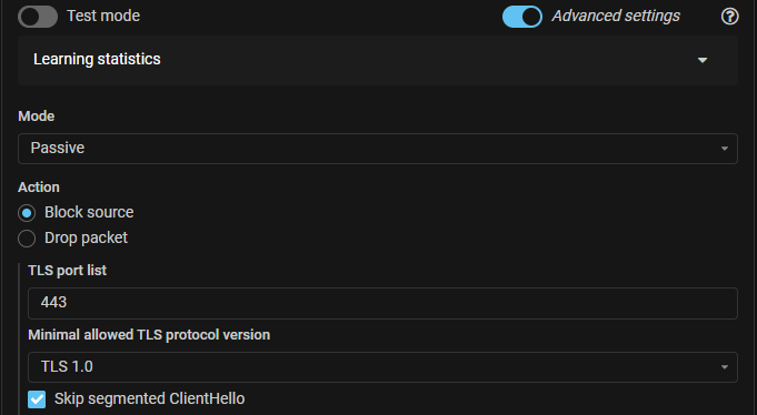 The countermeasure can work in multiple modes: one passive and five active. DTLS 1.3 is supported. The filtration by JA3 fingerprints, TLS Cipher Suite and TLS Extension is identical to ATLS countermeasure.