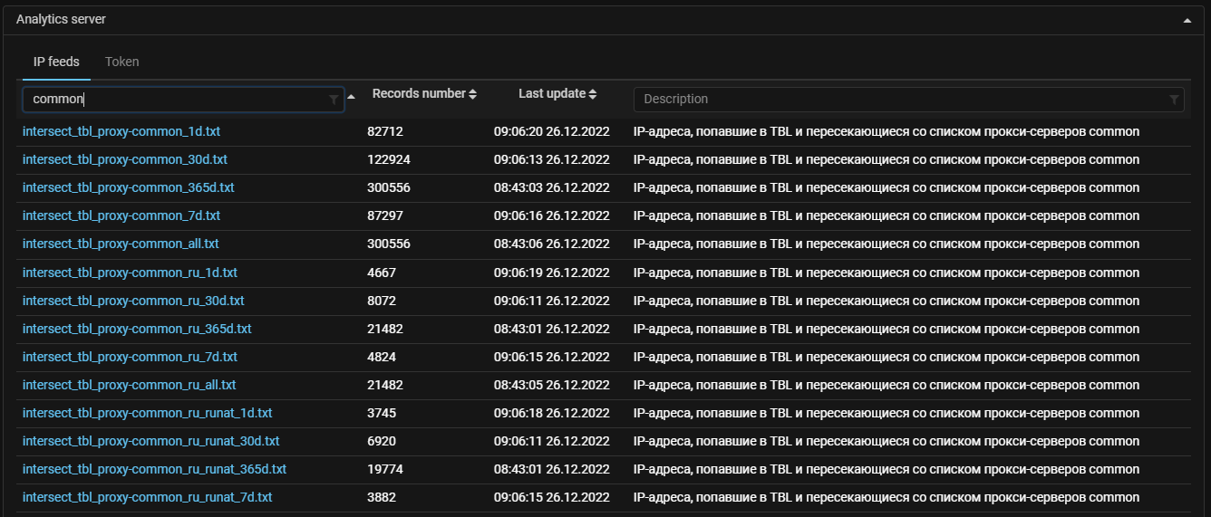 Analytics server panel has been reworked. Now if you specify a server access token, the “IP feeds” tab appears with a list of all available feeds. For each feed, the list displays the number of entries, the date and time it was last updated, and a description. The feed can be downloaded by clicking on the title.