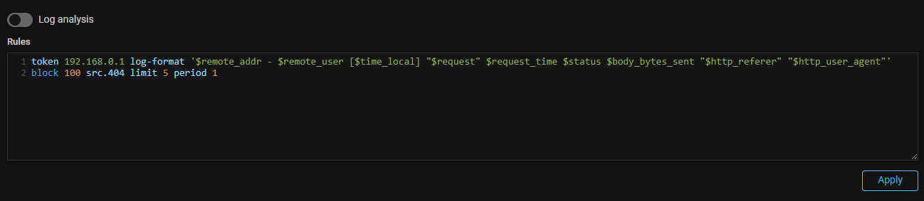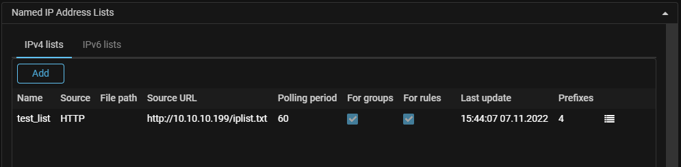 Now named lists of filtering rules containing named sets of filtering rules, like named lists of IP addresses, can be loaded from an external HTTP or HTTPS resource, from a file mounted in the backend container, or entered manually.