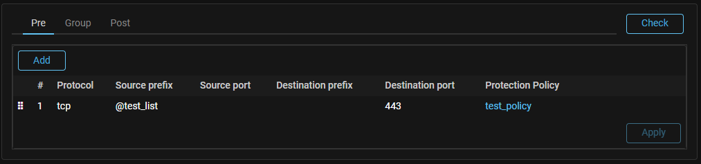 The countermeasure can also block the passage of network packets whose content does not match any of the specified rules. This function can be used simultaneously or independently with rules. If no rules are set, then the countermeasure blocks traffic from the IP address, similar to the SORB countermeasure.