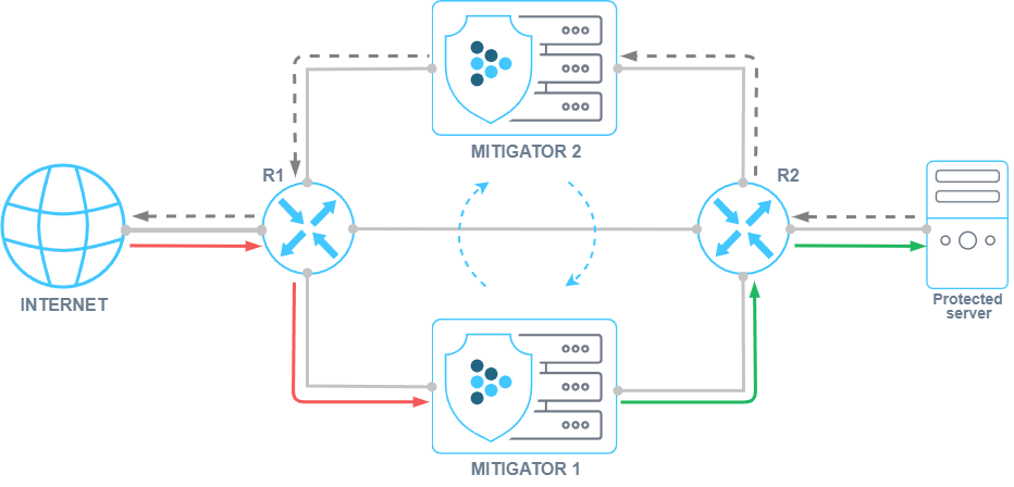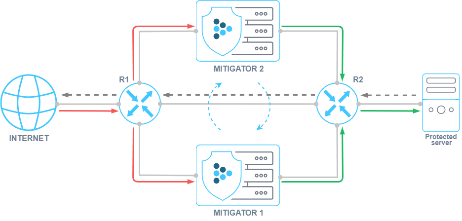The SPLI countermeasure is the only countermeasure in MITIGATOR that requires symmetry for traffic. However, if active-standby and active-active synchronization are enabled, it is possible to organize the operation of SPLI during traffic asymmetry, when client traffic arrives at one instance, and response packets from the server come to another.